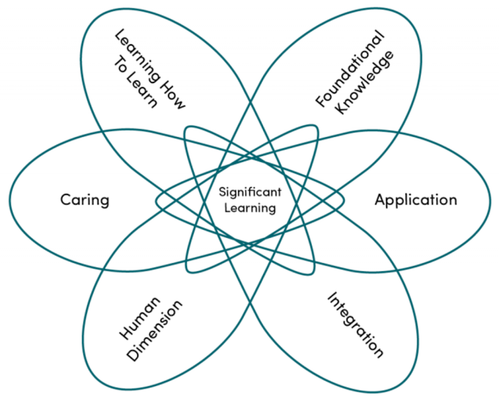 Often, instructors want students to do more than know content that is increasingly complex. Other goals may refer to students’ interaction within the larger program or within the world. Fink (2013) groups this larger learning focus into six groups, which he calls significant learning categories. Use these categories to analyze a course’s current learning outcomes to determine if there are categories that are either over or underrepresented.