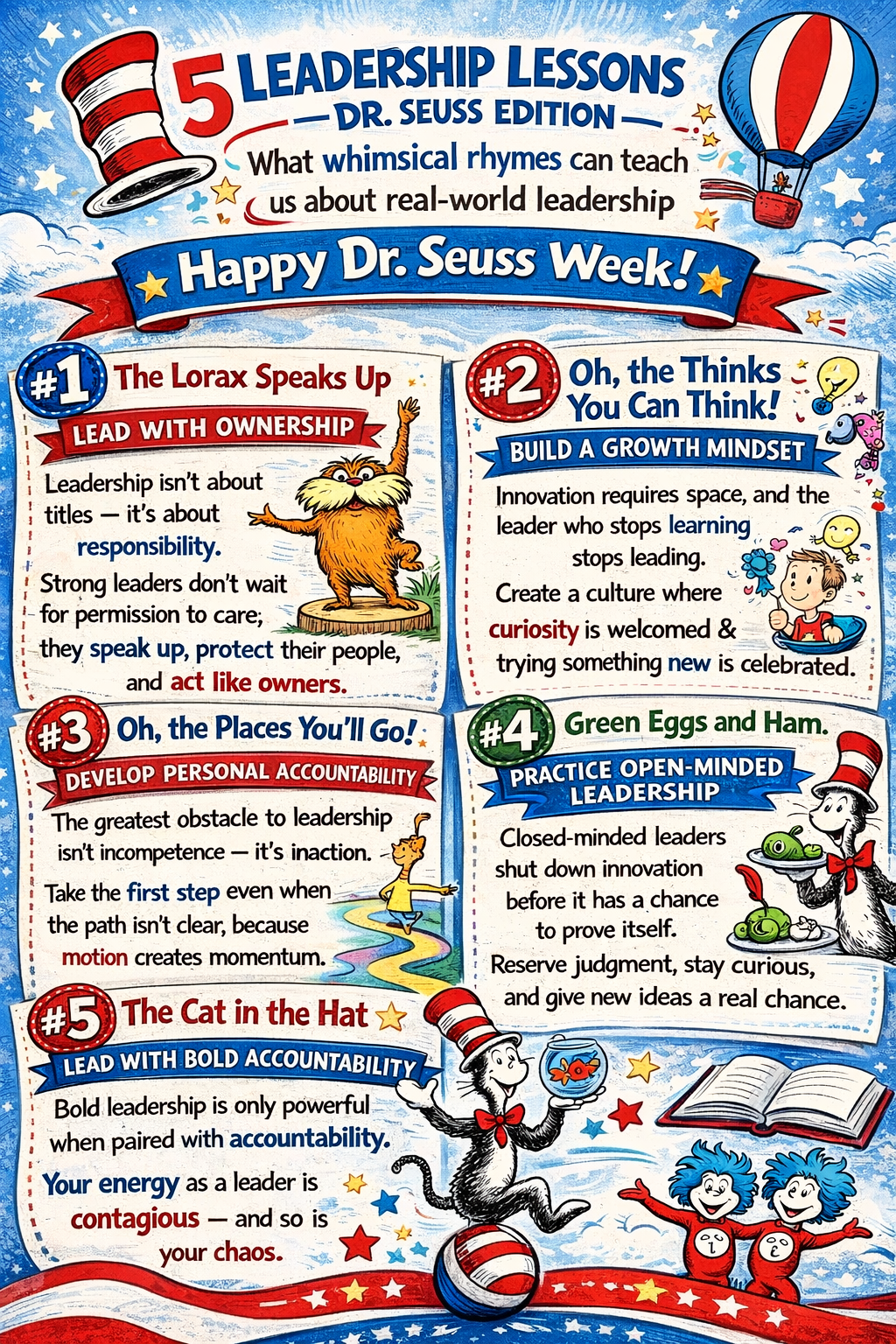 In honor of Dr. Seuss Week, let’s unpack five timeless leadership lessons hidden inside his most beloved works. Whether you lead a team of two or two thousand, these lessons are for you.